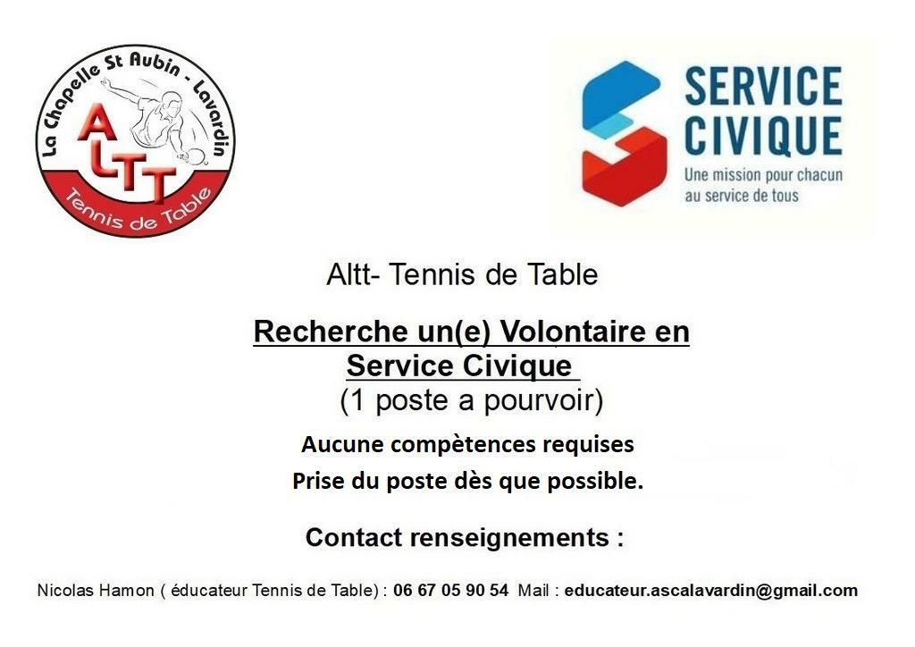 L’association ALTT – La Chapelle Saint-Aubin / Lavardin Tennis de Table – informe de l’ouverture d’un poste de volontaire dans le cadre du dispositif national du Service Civique.