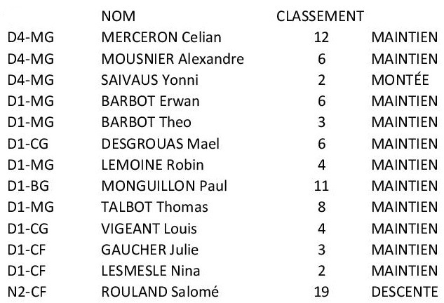Voici quelques résultats du Critérium Fédéral, toutes nos félicitations à Yonnis Saivaus pour sa montée en D3, bravo aussi aux super résultats de Nina, Julie, Théo qui terminent respectivement 2-3-3. D'autre part, petite note plus que positive pour Louis, Robin, Maël et Mathieu qui gagnent pas mal de points pour leurs classements !! Merci aux accompagnateurs et aux autres joueurs pour leur participation.