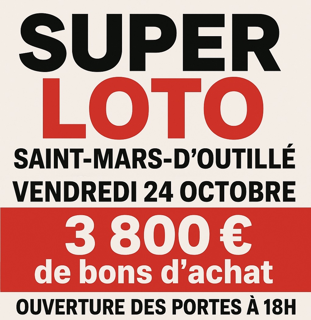 La commune de Saint-Mars-d’Outillé accueillera un Super Loto organisé par le club ALTT LA CHAPELLE le vendredi 24 octobre 2025 dans la salle des fêtes.