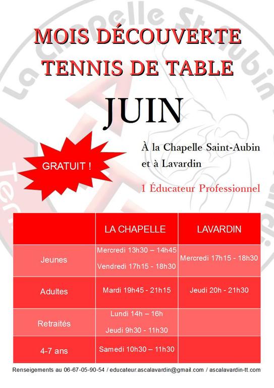 L'ASCA Lavardin Tennis de Table propose à toutes personnes non licenciées de venir essayer la pratique de l'activité gratuitement tout au long du mois de juin.