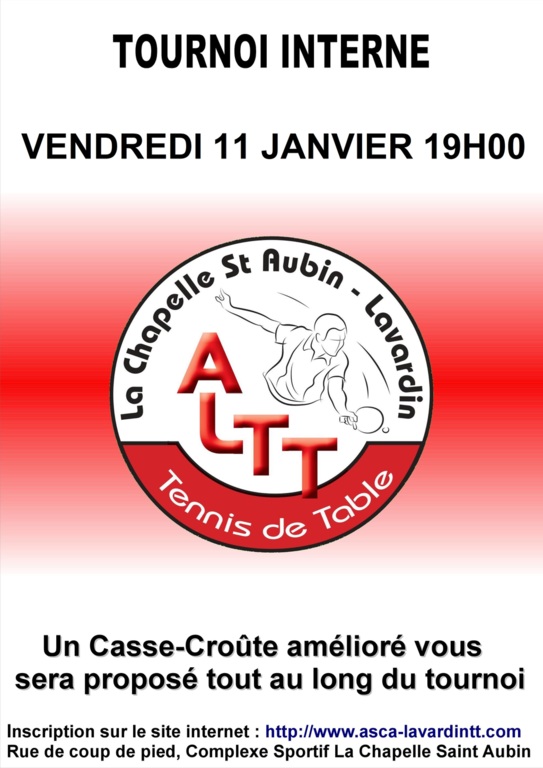 Le vendredi 11 janvier 2019 à 19H, nous organisons notre tournoi interne annuel à la Chapelle Saint-Aubin et nous serons ravis de voir un maximum de nos licenciés compétition y participer. Nous comptons sur vous pour venir nombreux pour partager mais surtout entretenir la convivialité et l'esprit sportif de notre club !